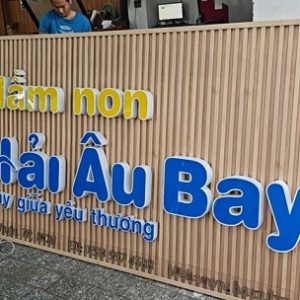 - Chữ nổi mica, alu lộng viền inox hoặc chữ nổi inox: Mang tính thẩm mỹ cực cao, thể hiện được sự chuyên nghiệp, sang trong cho các trường mầm non.