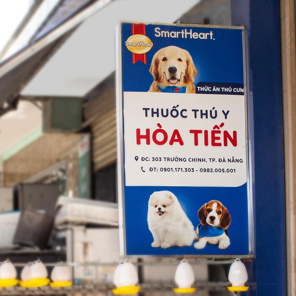 Tiệm thuốc thú y nên có biển hiệu rõ ràng, hình ảnh chó mèo dễ thương, phối màu xanh lá hoặc trắng. Có thể dùng thêm đèn LED hoặc hộp đèn ban đêm.