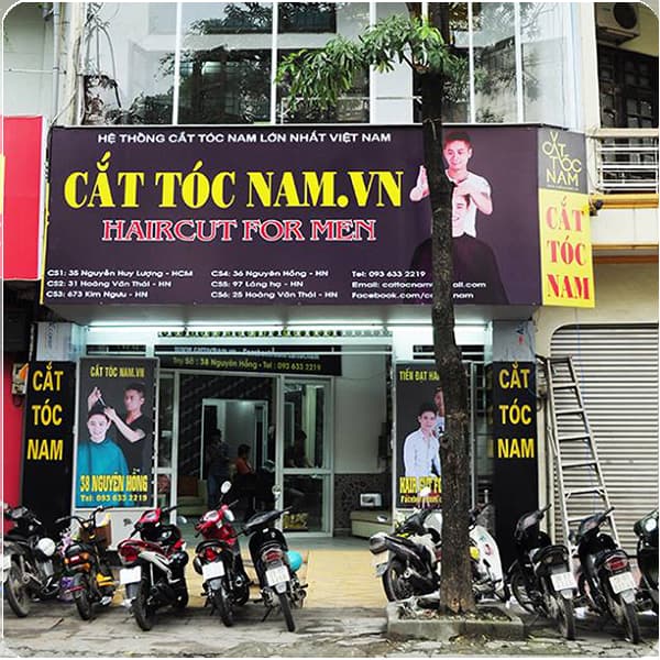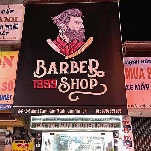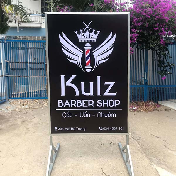 Dành cho salon tóc, barbershop – bảng in bạt có thể phối nền màu trầm (đen, xám) và hình ảnh tóc đẹp, giá dịch vụ, số điện thoại.