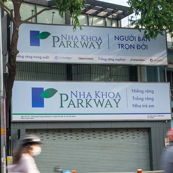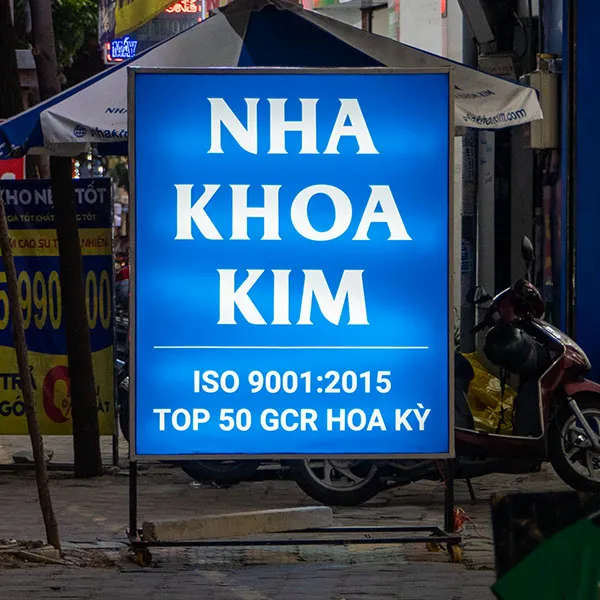 Biển hiệu nha khoa cần thể hiện được tính chuyên nghiệp và sự tin cậy. Tone màu xanh dương, trắng và biểu tượng răng – nụ cười là đặc trưng ngành.