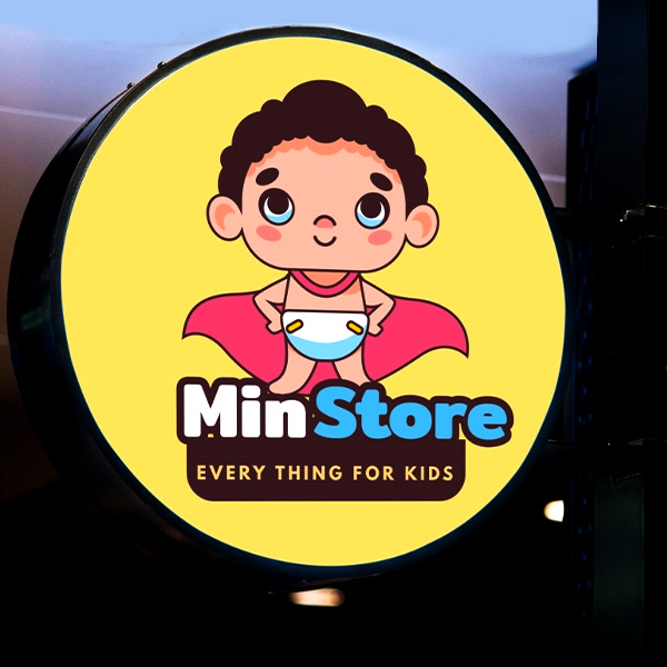 Bảng hiệu shop thời trang trẻ em hướng đến sự dễ thương, màu sắc tươi sáng như hồng, xanh, vàng. Thiết kế thường dùng icon hoạt hình, font bo tròn, dễ đọc.