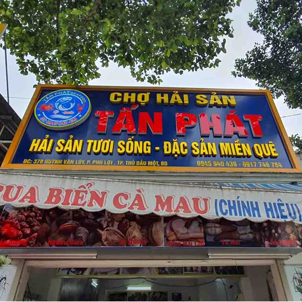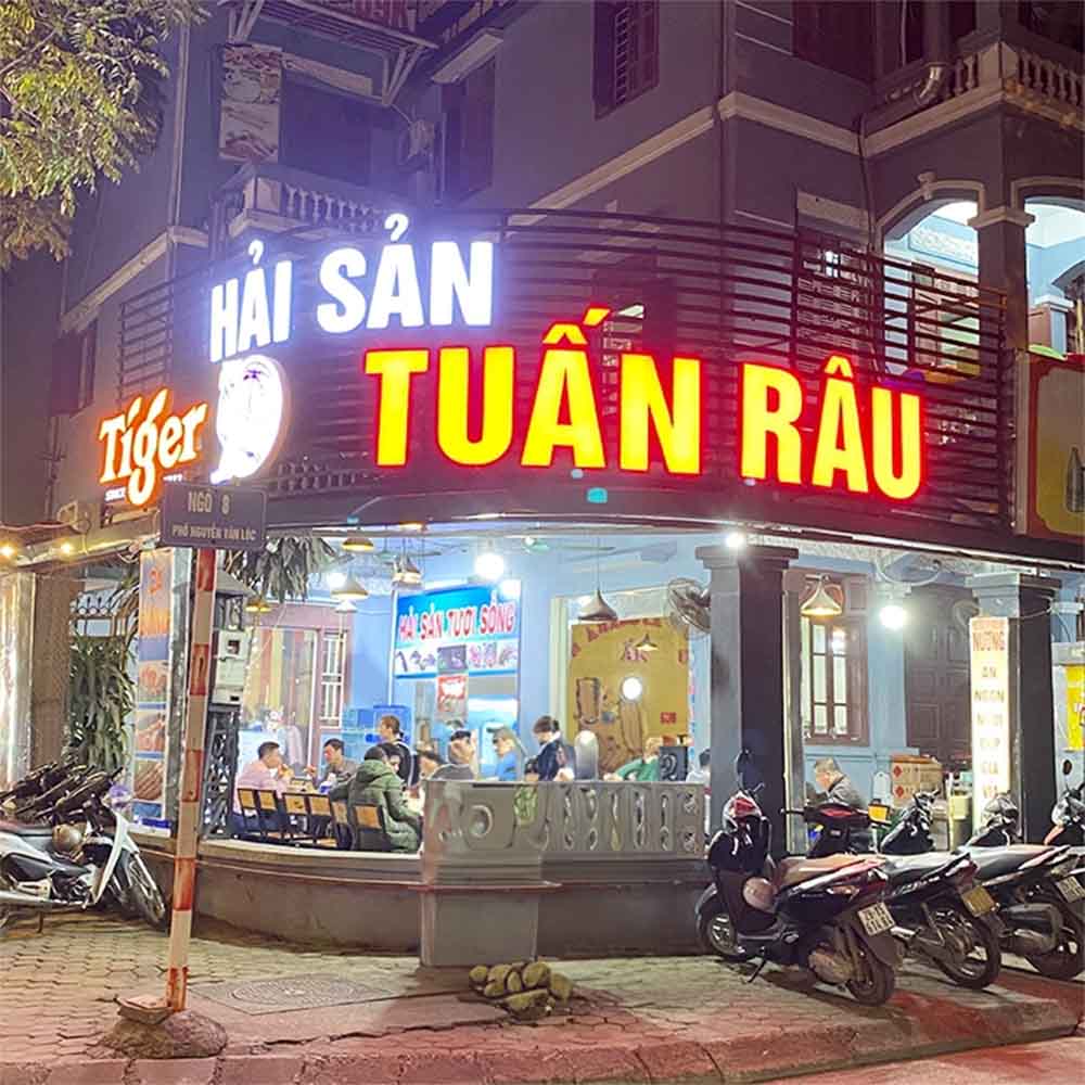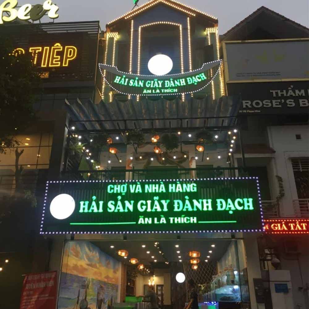 Biển hiệu quán hải sản thường dùng hình ảnh tôm, cua, mực, ốc… màu xanh dương hoặc đỏ nổi bật. Gợi ý thiết kế có chữ lớn và hiệu ứng đèn LED cho buổi tối.