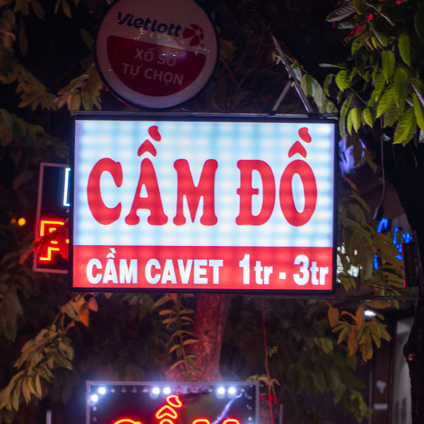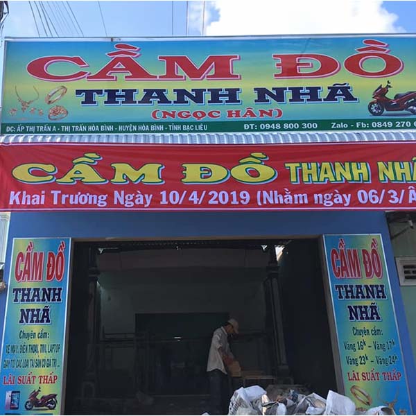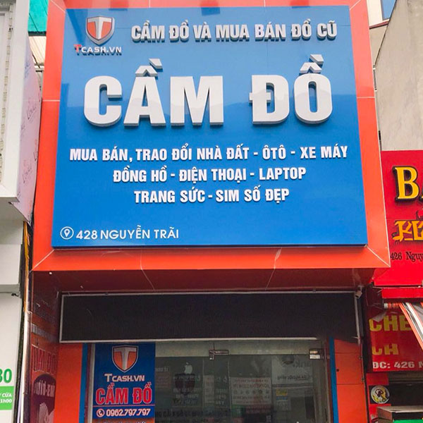 Bảng hiệu tiệm cầm đồ thường mang phong cách mạnh mẽ, rõ ràng, truyền tải thông tin dịch vụ chính như: cầm xe, vàng, điện thoại… Sử dụng chữ to, màu đỏ, đen, vàng để gây ấn tượng.