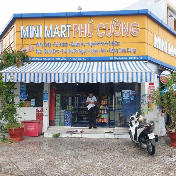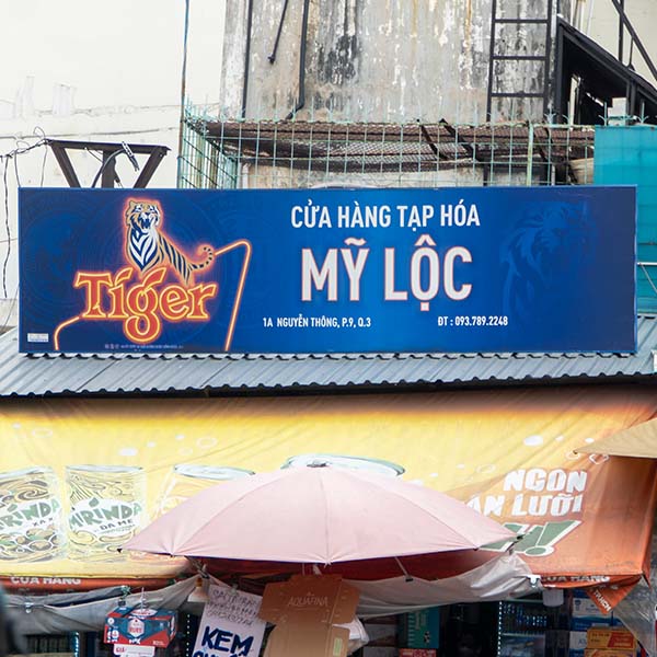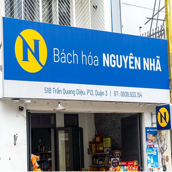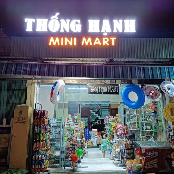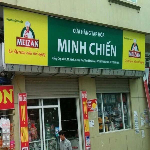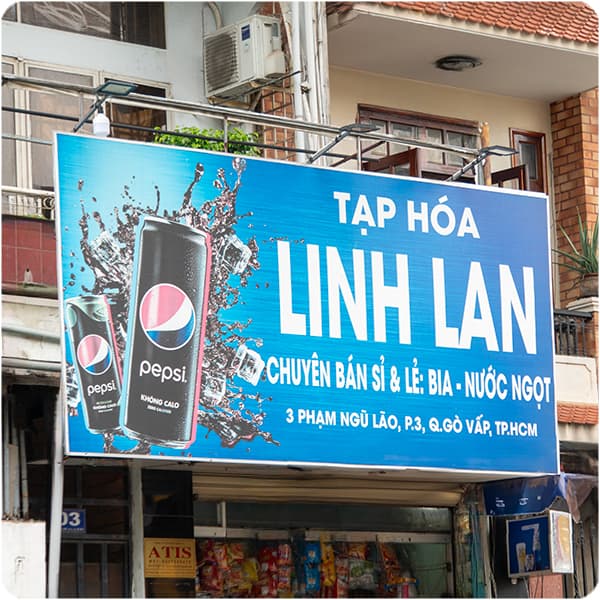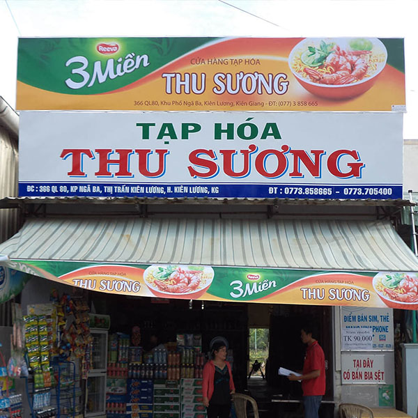 Bảng hiệu tạp hoá thường sử dụng bạt Hiflex hoặc form chữ nổi đơn giản. Gồm: tên tiệm, mặt hàng bán chính (nước, thuốc, thẻ…), hotline.